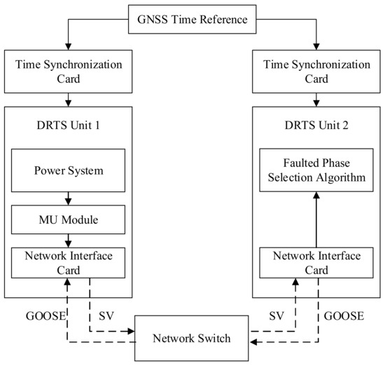 In an attempt to evaluate its performance with respect to commercial relays, the transient-based algorithm was tested using a test setup similar to the one used to test the commercial relays, as explained in Section 4. The method proposed in [21] was implemented as a real-time process on a different DRTS unit, as depicted in Figure 7. The algorithm, which was also developed using standard library components, received instantaneous current and voltage measurements as IEC 61850-9-2 LE sampled values (SV) from the original DRTS unit simulating the power system [30,31,32]. A schematic of the setup for testing the transient-based scheme is given in Figure 8. Note that the two DRTS units were independent and connected only through an external, real communications link that served as the IEC 61850 process bus [30,31,32]. In addition, the simulation time step of both DRTS units was synchronized to a common GNSS (global navigation satellite system) time reference.