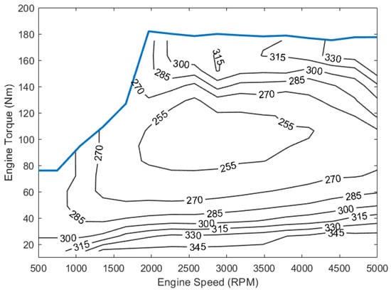 The HEV uses a Spark Ignition (SI) engine with a 6-speed transmission, both of which are modeled using lookup tables. The engine and transmission specifications are summarized in Table 3, and a Brake-Specific Fuel Consumption (BSFC) map representing the engine efficiency is shown in Figure 2.