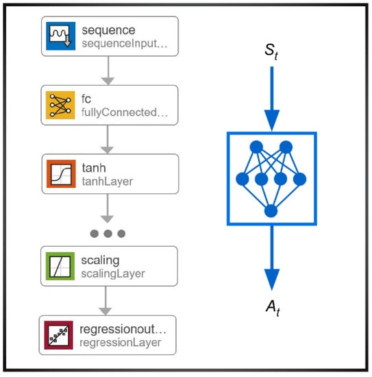Based on heuristic considerations and performance evaluations, the NN is designed in this research such that the actor network has six fully connected hidden layers, with all hidden layers having 300 nodes each. The architecture of the actor network is shown in Figure 5. It should be noted that the reward values depend highly on the critic target network. If the critic target network is not well trained, it will limit the agent’s capability to explore an optimal policy. For this reason, the offline data are used only for training the actor target network of the HDDPG agent.