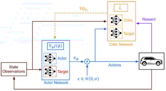 - Lillicrap, T.P.; Hunt, J.J.; Pritzel, A.; Heess, N.; Erez, T.; Tassa, Y.; Silver, D.; Wierstra, D. Continuous control with deep reinforcement learning. arXiv 2015, arXiv:1509.02971. [Google Scholar]