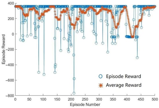In this research, it was hypothesized that the offline–online hybrid DDPG has a higher convergence rate and shows better fuel economy performance than the original DDPG algorithm. When trained with various driving patterns and durations, the HDDPG agent actually showed a better convergence rate than the DDPG agent in most cases. Using the learning parameters shown in Table 8, the HDDPG and DDPG algorithms were trained, and the results were recorded. Example reward change plots over episodes during training are shown in Figure 8 and Figure 9 for HDDPG and DDPG, respectively.