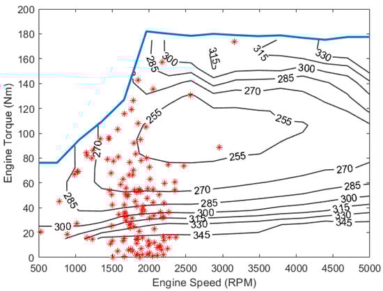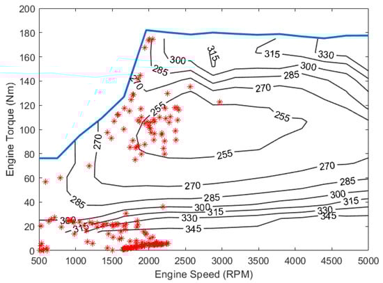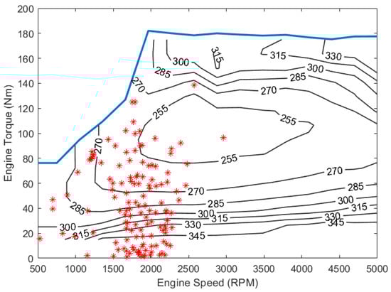 In Table 9, UDDS, US06 and HWFET are three commonly used standard drive cycles, where UDDS represents an urban drive pattern, US06 shows the highest average speed and extreme accelerations and HWFET is a typical highway drive cycle featuring high speed and zero stop. Two additional real-world drive cycles, T-Town and T-Highway, are also used to represent distinct driving characteristics near the city of Tuscaloosa, Alabama, where T-Town shows a typical urban driving condition with low average speed and many stops at traffic signals and T-Highway shows the traffic condition on Highway US-82, which include a higher speed and more complicated traffic situations. It can be seen in the table that the HDDPG algorithm shows the best energy performance in all cases and has significant improvements over the DDPG algorithm. When compared with the A-ECMS algorithm, HDDPG also shows improvements in most cases except US06. The engine BSFC maps with the operation points are shown in Figure 11, Figure 12 and Figure 13 for the three algorithms over the UDDS cycle with sampling at every 5 s.