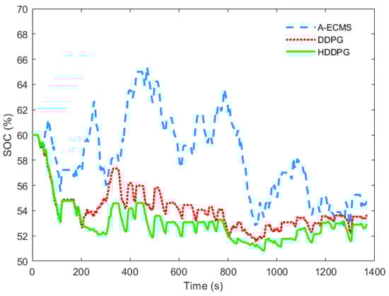 It can be seen from Figure 14 that the HDDPG uses more battery energy than the other two algorithms without actively recharging the battery using the engine often. In Figure 15, it can be seen that A-ECMS uses the electric motor more frequently with larger amplitudes and applies more engine power to recharge the battery, which decreases the overall fuel economy. The HDDPG algorithm achieves a better fuel economy than the other two algorithms by using the electric motor more efficiently. As a result, the battery current for HDDPG shows a smoother profile with lower peaks in Figure 16. In all cases, the final SOC values are within 2% of each other.
