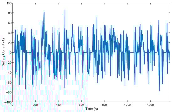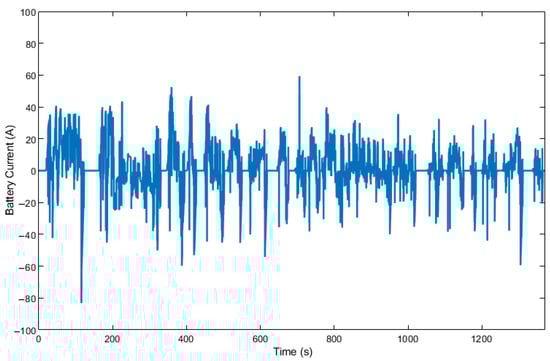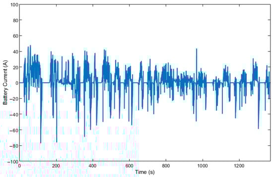 The engine BSFC map shows the efficiency of the engine at different torque-speed combinations. It can be seen from Figure 11 that A-ECMS controls the engine’s operation frequently in the high-efficiency region (255 g/kWh). A-ECMS also operates the engine in the low-efficiency region quite often (345 g/kWh). On the other hand, the two DRL-based algorithms show a more diverse distribution of the engine operation points. From Figure 12 and Figure 13, it can be seen that the engine operates more around the region of 270 g/kWh compared to A-ECMS. This is due to the probabilistic nature of the learning-based control algorithms. HDDPG tries to explore a new control policy to further improve the fuel economy, which makes it behave differently from A-ECMS. Meanwhile, since the HDDPG utilizes offline-trained target networks, the engine works more efficiently when compared with the traditional DDPG algorithm. In Figure 13, it can be seen that, without the pretrained network, the DDPG shows a wider distribution of engine operation points compared to the HDDPG algorithm, especially at engine torques higher than 140 Nm. At the same time, only a very small number of operation points appear in the high-efficiency region, which reduces the overall fuel economy. Due to the difference in the power flow control, the three control algorithms utilize the battery power differently. Figure 14 shows how the battery SOC changes over the UDDS cycle with the three different control algorithms. The battery current changes produced by the three algorithms over the UDDS cycle are also shown in Figure 15, Figure 16 and Figure 17.
