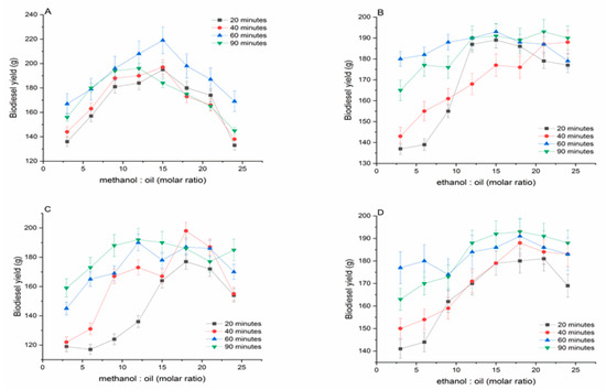 Correlation between the biodiesel yield (g) and the molar ratio of alcohol:oil. (A,B) rapeseed oil; and (C,D) sunflower oil. Data are reported as the average ± SD (n = 3).