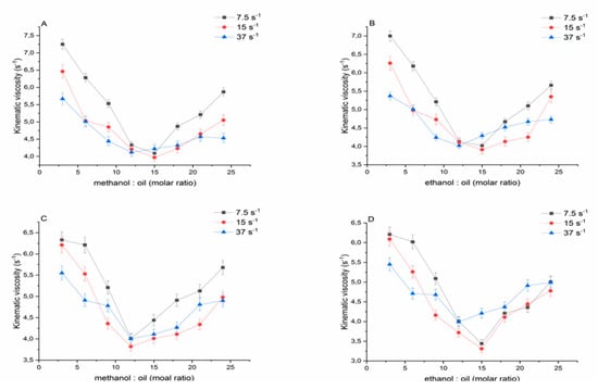 Kinematic -viscosity (40 °C, mm2/s2) of rapeseed biodiesel obtained using methanol (A) and ethanol (B), and sunflower biodiesel obtained using methanol (C) and ethanol (D) at a different alcohol to oil molar ratio. Data are reported as the average ± SD (n = 3).