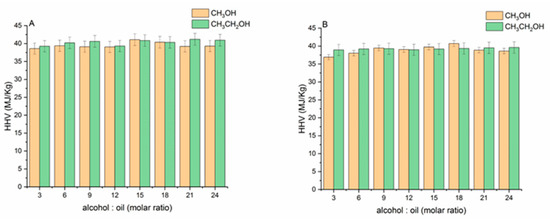 HHV of biodiesel obtained at various alcohol: oil molar ratio. (A) rapeseed biodiesel and (B) sunflower biodiesel. Data are reported as the average ± SD (n = 3).