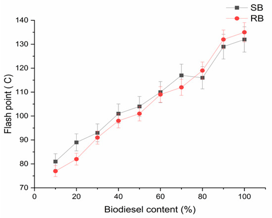 The trends in Figure 5 show that the highest flashpoint for pure BS and RB are similar without a statistical difference. In the case of biodiesel-diesel blends, as expected and reported in several published works [38], increasing the percentage of diesel in the blend biodiesel-diesel causes the flash point temperature decrease, reaching the lowest value at around 80 °C for SB and RB (10% biodiesel–90% diesel) (This is due to the fact that diesel has a lower flashpoint compared to biodiesel, and thus the resulting blend (diesel-biodiesel) has a lower flashpoint than the pure biodiesel. The reduction in the flashpoint value is proportional to the percentage of diesel in the blend. As a general conclusion, no statistical differences have been observed in the SB and RB flash point vs. biodiesel content as the trends overlap.