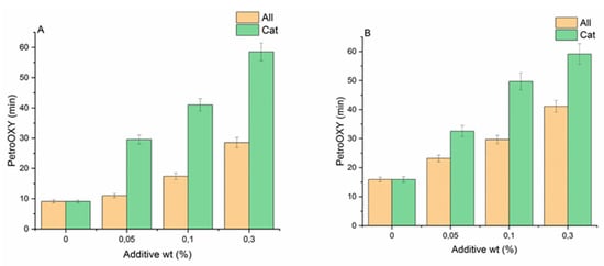Variation of PetroOXY induction time (min) for rapeseed biodiesel (A) and sunflower biodiesel (B) without and in the presence of two additives (All = 4-allyl-2,6-dimethoxyphenol; Cat = cathecol).