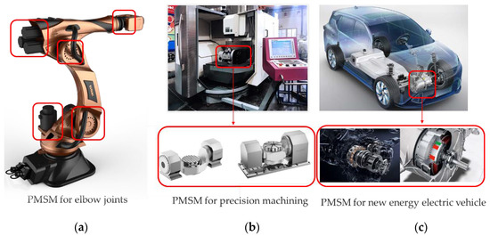 Typical applications of permanent magnet synchronous motors in the environmental energy industry: (a) robots; (b) high-precision servo equipment; (c) new energy electric vehicles.