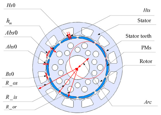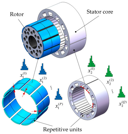 Assume a surface-mounted permanent magnet synchronous motor (PMSM) with P poles and Q slots, of which the schematic diagram of repetitive units of the PMSM is shown in Figure 3. Several uncertainties from a single source can be involved owing to repetitive units in the PMSM. Their variation of structures and material properties can be approximately regarded as random variables following a Gaussian distribution. In this paper, “repetitive units” is used to describe the structural characteristics of the PMSM.