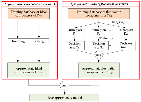 Secondly, for the fluctuation component of Tcpp, g1(ζ), that is g1((Z − X)/X), caused by manufacturing deviation rate (Z − X)/X, the random forest (RF) method [20] based on bagging [21,22] is used for the establishment of the approximate model. First, the subspaces of the fluctuation component training database are constructed. The manufacturing deviation rates and the corresponding Tcpp fluctuation component database obtained by DoE in Section 2.2 are sampled with replacement multiple times based on bagging, and various training database subspaces are obtained. The subspaces of the training database R1, R2, …, RG, and corresponding decision trees T1, T2, …, TG are obtained. Each subspace contained several pieces of training data from the entire training database, and the number of training data contained in all decision trees far exceeded the total number of the training database. Then, the database of each subspace Rg is trained to establish a decision tree Tg to approximate the fluctuation component of Tcpp. According to the information gained, the order of the input parameter features in the leaf nodes of the decision tree is determined. Then the training data are divided according to the judgment index of the input parameter features at each leaf node until it cannot be divided further. The training objective of each decision tree is to minimize the difference between the predicted fluctuation component from the output of the tree and the actual fluctuation component, which means that the tree’s output is close to the actual value. The training objective is shown as follows: