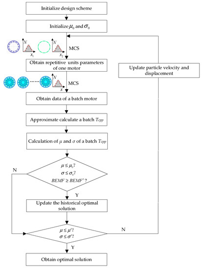 Different combinations of design parameters affect the consistency of output characteristics of the PMSM. In order to improve the consistency of output characteristics of the batch PMSM, it is necessary to find some design schemes to make the mean values of the output characteristics as close as possible to the design object and distributed in a concentrated manner in the presence of manufacturing deviation while ensuring the performance also meets the requirements. In this study, the particle swarm optimization (PSO) method is used to optimize the design parameters and realize the robust design of the PMSM, considering the manufacturing uncertainties of repetitive units. The optimization objective function is shown in Equation (19). The optimization objective is to minimize the mean and standard deviation of the Tcpp of the PMSM, and the constraint is that the no-load back electromotive force (BEMF) is not lower than its threshold. The optimization will be stopped when the mean and standard deviation of the Tcpp are lower than their respective thresholds. The specific implementation is shown in Figure 6.