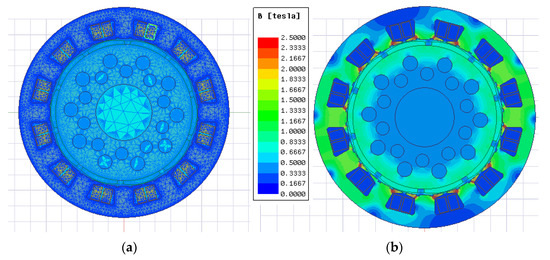 Meshing and magnetic density analysis of the PMSM: (a) meshing; (b) magnetic density analysis.