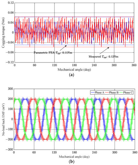 The electrical characteristic of the PMSM: (a) cogging torque waveform (measured and parametric FEA results); (b) no-load back EMF.
