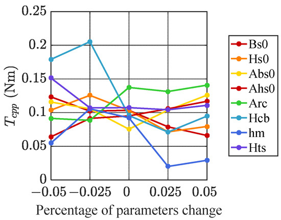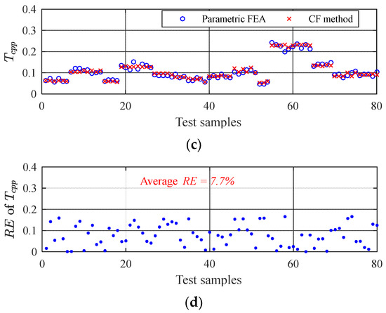 - The parametric FEA considering the uncertainties of the PMSM is conducted, and the most significant parameters are screened. DoE samples the parameters with and without tolerances. Through parametric FEA, the center values and manufacturing deviation rates of the parameters, as well as their corresponding ideal components and fluctuation components of Tcpp, are extracted, and the training database of the two components is established.