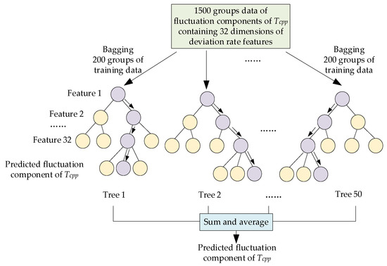 When the model is used to approximate the fluctuation component of Tcpp, assuming that the number of the decision tree is G, the manufacturing deviation rates should be input to the fluctuation component model. Then the outputs of all decision trees are averaged to obtain the predicted value of the final fluctuation component of Tcpp as Equation (15):