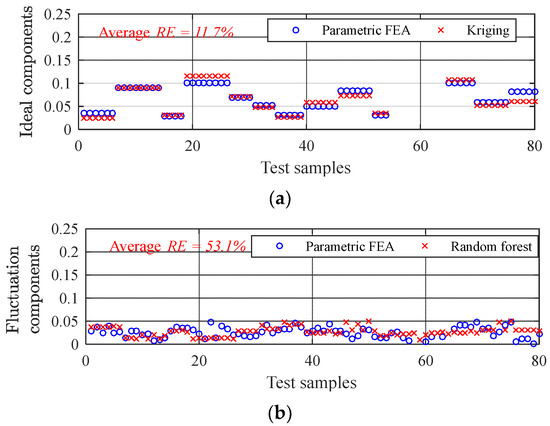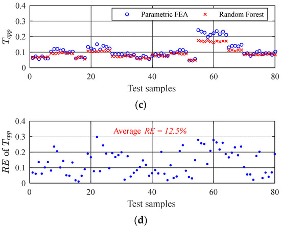 In order to solve the above problems, we propose an RDO method based on approximate modeling considering manufacturing uncertainties, in which the approximate modeling is based on the traditional approximate modeling without considering the uncertainty, supplemented with the approximate modeling of the fluctuation component caused by the uncertainties. The two parts of the model are added together to obtain the approximate model considering the uncertainties. The approximate model is applied to the RDO process. Firstly, to decouple the effect of the center values and the manufacturing uncertainties of the design parameters on the Tcpp, we divide the Tcpp into the ideal component dominated by the center values of the design parameters and the fluctuation component jointly affected by the manufacturing uncertainties. The two components are sampled and modeled separately. Then, an approximate model is conducted separately for the two components. The relationship between the center values and the ideal component of Tcpp is the model without considering uncertainties, so it can be directly modeled by using the conventional approximate modeling method. As the theoretical analysis shows that the fluctuation component is related to the center values and manufacturing uncertainties [9,16,17,18], the fluctuation component can be approximately obtained by the manufacturing deviation rates. The manufacturing deviation rate is the ratio of the manufacturing deviation and center values. The higher the dimension of the manufacturing deviation of repetitive units, the higher the approximate complexity. Therefore, when the training samples are relatively limited, the random forest (RF) was used to model the fluctuation component. On the one hand, the bagging method was used to expand the number of training samples; On the other hand, the relationship between the manufacturing deviation rates of parameters and the fluctuation component of Tcpp is trained by decision trees. The output of the fluctuation component model is added to the output of the ideal component model, and the Tcpp considering manufacturing uncertainties is obtained. Finally, the proposed approximate model is applied to the RDO of the PMSM to reduce the mean and standard deviation of the motors’ Tcpp, verifying the scheme’s effectiveness.