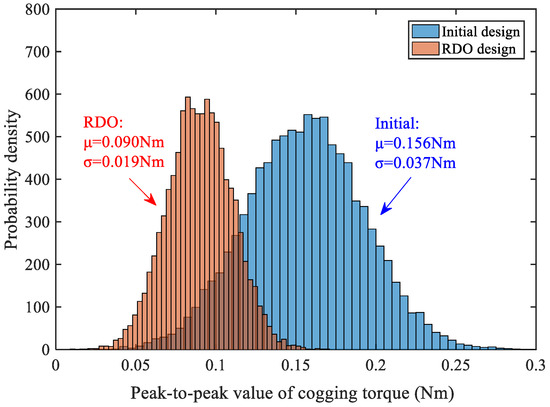 In order to improve the product quality in a batch of motors, many scholars have adopted robust design optimization (RDO) [7,8] to improve the robustness of Tcpp. RDO refers to finding the design that makes the output response least sensitive to noise with the existing manufacturing uncertainties. Many scholars have introduced RDO into the optimization of motor efficiency, controllers, vibration, and Tcpp, and most of these research activities are based on finite element analysis (FEA). However, the conventional RDO methods using electromagnetic simulations are usually based on symmetry models in which these uncertainties of permanent magnets and stator slots from repetitive units are treated as a single random variable. They deal with different design variables or parameters as a single uncertainty. It is necessary to utilize a complete model due to the combined effect of the uncertainties caused by repetitive units being different from that of a single variable [9]. The FEA is time-consuming because the RDO process requires many iterative simulations. Therefore, an approximate model is proposed to replace the FEA to improve the optimization process efficiency. Some scholars have adopted Kriging [10], support vector machines (SVMs) [11], and the response surface model [12] for RDO. When considering the manufacturing uncertainties, the number of samples required by the conventional approximate modeling method increases sharply with the increase in design parameters, which brings apparent limitations to the approximate modeling of Tcpp. Lee and Kim et al. establish an approximate model of output response using analytical methods but only focus on optimizing a single design parameter when considering the manufacturing uncertainties of repetitive units [13,14,15]. However, the relationship between various design parameters and the Tcpp is nonlinear. Thus, multi-parameter or global optimization of the motor is not equivalent to the superposition of individual single-parameter optimizations. Therefore, the optimal global solution cannot be obtained by optimizing a single parameter, which is not suitable for the design process of multiple design parameters.