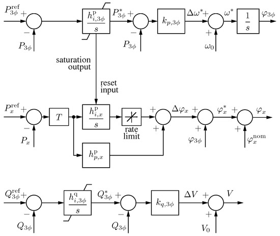 where is a constant saturation limit, namely, or . In the same way, the reactive power controller also saturates