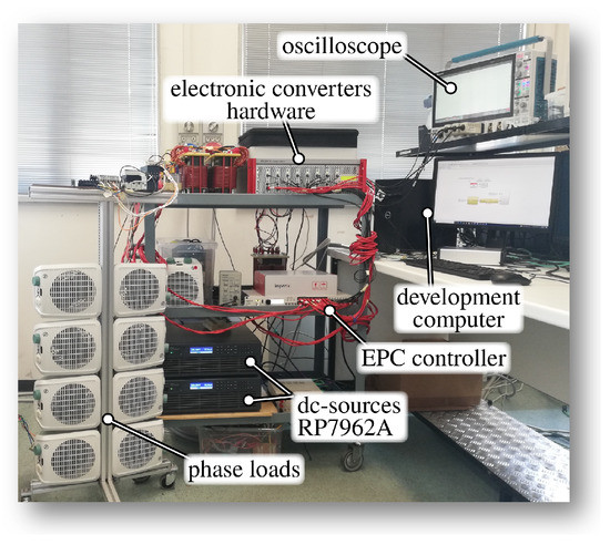 The proposed controller was tested with simulation and by means of a laboratory-scale experimental prototype implementing the system in Figure 2. The system parameters related to the EPC hardware and control are listed in Table 2. The control technique in Figure 4 was deployed in a B-Box controller manufactured by Imperix Ltd., through which the EPC controller was implemented. The EPC hardware was implemented by using three modules PEB8032 manufactured by Imperix Ltd., and the grid voltage was generated by using a three-phase voltage source implemented with three additional modules of the same type. A photo of the used experimental setup is displayed in Figure 5.