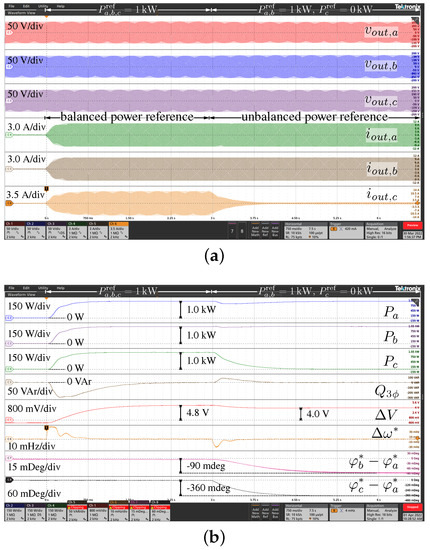 Figure 6 and Figure 7 display the most significant experimental waveforms to show the chief features of the control. The instantaneous three-phase voltages and currents are reported in subfigure (a), while subfigure (b) displays the related active power , , and and reactive power , the voltage amplitudes deviation , the frequency deviation , and the phase displacement with respect to the first phase (i.e., and ). The results are discussed next.