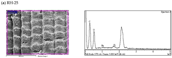To provide the surface structure of the torrefied RH products, SEM was used to observe the morphological changes. It revealed the smooth surface of unpretreated-RH-torrefied products in the previous study [29]. After alkaline pretreatment, the surface of pretreated RH and RH-torrefied products became rougher, as shown in Figure 5. This could be attributed to the partial removal of the outer non-lignocellulosic layer composed of components such as hemicellulose, lignin and wax, and other impurities (e.g., silica) contained in the RH-torrefied products [49]. In addition, based on the preliminary EDS analysis (Figure 5), the elemental compositions were observed on the surface of the feedstock (RH-25) and the optimal product (T-SP-280-30). It showed that the major elements included carbon (C), oxygen (O), silicon (Si) and sodium (Na). In addition, the carbon and ash contents in the T-SP-280-30 were higher than those in the RH-25, suggesting potential slagging/fouling in boilers or gasifiers when co-firing torrefied RH product with pulverized coal could be considered [33]. In order to evaluate the slagging and fouling tendency of solid fuels, some indices have been developed and reviewed in the literature [31,32,33,50,51]. It was concluded that silica is the predominating index for evaluating the lagging and fouling tendency of biomass fuels due to the melt formation of “sticky” silicates. The critical silica content in the fuel ash was in the range of 20 wt% to 25 wt% [50], showing low slagging and fouling tendency for less than 20 wt%. Accordingly, the RH-based fuels should pose a low slagging and fouling tendency in the industrial boilers during the combustion and/or co-firing.