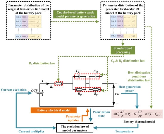 A virtual battery pack can be developed by combining the equivalent circuit model of the battery cell and the new battery pack parameters generated based on the copula method, as shown in Figure 2. The virtual battery pack also includes a lumped thermal model to comprehensively describe the behaviors of the battery, including the electrical performance and the thermal variations [27]. The parameters of the electrical model are highly dependent on the temperature, and the electrical behavior of the battery generates heat. Therefore, the electrical and thermal models are coupled to each other. Specifically, when the battery is excited, the terminal voltage and heat generation power can be calculated according to the electrical model. After the heat production, the temperature of the battery is calculated according to the thermal model. On the other hand, the battery’s parameters change with the temperature, which in turn affects the output voltage of the electrical model. Subsequently, the heat production power of the battery changes, which will affect the temperature rise of the battery.