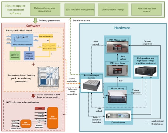 Figure 3 presents the framework of the BMSs testing platform, which mainly consists of hardware and software parts. The hardware part includes four modules: the tested samples module, analog signal module, high precision collection module, and real-time simulation system module. The software includes the high-precision battery pack equivalent circuit model and SOX reference value estimation. In addition, the upper computer management software can be responsible for the interaction between the machines and researchers, including data monitoring and the data visualization design of each module of the platform, the management of the test conditions, the starting state setting of the battery pack model, and the start-stop control of the test.
