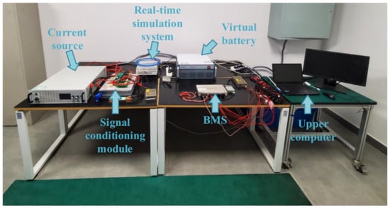 Figure 4 displays the physical view of the virtual battery-based BMS testing platform. The hardware part mainly realizes the interaction between each hardware module through the real-time simulation system. Overall, the dSPACE controls the outputs of the analog signal sources, such as the voltage output of the virtual battery and the current output of the current source. Then, the BMS under test and the high-precision acquisition equipment simultaneously acquires data from the analog signals and transmits the data back to the dSPACE, which can realize the evaluation of the BMSs acquisition accuracy. Eventually, the BMSs estimation accuracy is evaluated by comparing the SOX estimation results of the measured BMS with the SOX benchmark values obtained by the algorithm embedded inside the real-time simulation system.