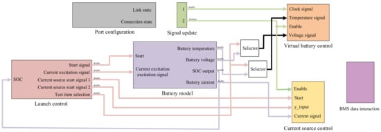 In this paper, the software part of the testing system is designed based on Simulink in MATLAB, whose structural block diagram is shown in Figure 5. The software part is divided into seven modules: the launch control module, battery model module, virtual battery control module, current source control module, BMS data interaction module, signal update module, and port configuration module. Among them, the battery model is the core of the software part, which is mainly used to control the output value of analog signals, such as the battery cell voltage, battery cell temperature, and total current. The function of the virtual battery control module is mainly to control the output signal of the hardware part by converting the calculation results of the model into the data that the device can recognize according to the specified communication protocol. The current source control module ensures that the current path is always maintained during the signal tuning of the unidirectional current source.