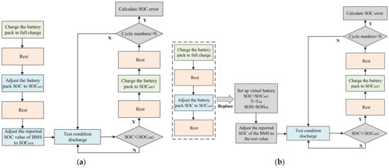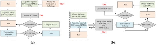 SOC error correction speed test flow: (a) based on actual battery pack; (b) based on virtual battery packs.