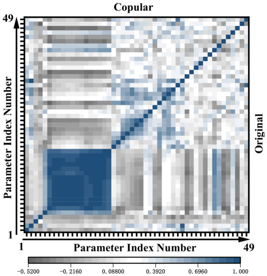 In order to assess the correlation between the parameters, Pearson correlation coefficients were calculated separately for the original data and the newly generated parameters obtained by the Copula-based sampling method, as shown in Figure 9. The upper triangle is the correlation of the generated parameters, and the lower triangle is that of the original parameters. It is easy to see a strong correlation between the specific parameters, and the battery pack’s parameters obtained by the Copula-based method show close correlation characteristics with the original data.