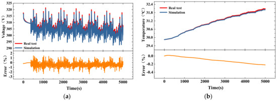 To illustrate the feasibility of the battery pack modeling method shown in Figure 2, a Highway Fuel Economy Test (HWFET) condition was used to validate it. Figure 10 shows the battery pack model’s terminal voltage and average temperature curves. Figure 10a represents that the maximum error of the terminal voltage is 2.39%, and the Root Mean Square Error (RMSE) is 1.602 V. This paper uses the average temperature to describe the thermal behavior of a virtual battery pack model. Figure 10b shows that the maximum error of the average temperature is 0.22%, and the RMSE is 0.039 degrees Celsius. The results show that the battery pack model obtained based on the proposed method can better simulate the voltage characteristics of the battery pack, so that it can meet the requirements of virtual battery-based BMS testing.