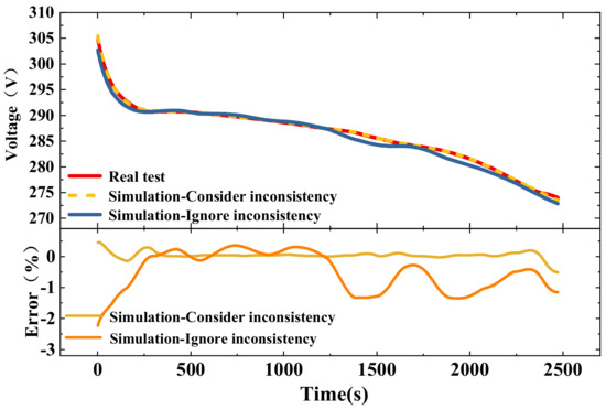 The constant current discharge experiment is carried out on the battery pack to demonstrate the necessity of considering inconsistency. The unique individual with the least total internal resistance is used as the primary cell of the battery pack model that ignores inconsistency. In Figure 11, the simulation result ignoring the inconsistency compared to considering the inconsistency increases the maximum error by 2.69 V. The energy utilization efficiency (EUE) of the actual battery pack is calculated to be 67.43%, while the EUEs considering inconsistency and ignoring consistency are 67.44% and 68.57%, respectively. The EUE is calculated as shown in Equation (19). Therefore, considering the inconsistency of the battery pack is closer to reality, and it has a lower EUE than ignoring the inconsistency.