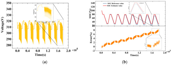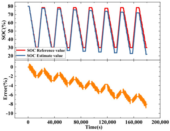 After the SOC cumulative error test and the SOC error correction speed test are performed on the BMS, the error between the estimated value of the BMS and the SOC reference value is calculated by Equation (9), and SOCREF is obtained from Equation (8).