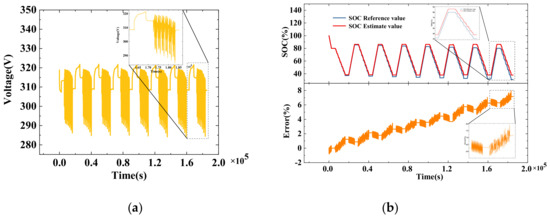 Before evaluating the SOC estimation from the BMS, the SOC reference value needs to be accurately obtained. In practice, the battery pack’s charging or discharging is limited by the battery cell that achieves the full charge or the full discharge. In this paper, the battery pack’s SOC reference value is calculated using the definition based on the battery cell, as shown in Equation (8). SOCi is computed with the data collected using high-precision acquisition equipment and CAPi are obtained by the Battery Cell Capacity Test (see Appendix A). Therefore, the SOC of the battery pack calculated based on Equation (8) must have a higher accuracy than the SOC estimated by the BMS, and it is feasible to use it as a reference value.