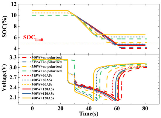 The SOP estimation based on the feature chart method is to establish a data table of the peak power with each influencing factor from the offline test results. This method can quickly obtain the SOP by looking up the table, and the calculation burden is low. According to the practical usage scenario of the battery pack, this paper takes the current, voltage, temperature, and SOC as the boundary of the peak power and considers the initial polarization state when conducting a constant power charge/discharge test. Considering the peak power test in the discharge direction, the multi-boundary peak power test conditions for different polarization states are shown in Figure 8. After the initial polarization establishment phase, the peak power output is performed until the output meets one of the following conditions: Ipeak > Ilimit; Vmin < Vlimit; Tpeak > Tlimit; SOCmin < SOClimit. The peak power output time tpeak is recorded. After changing the battery’s state conditions (the SOC and temperature), the relationship between Ppeak and tpeak can be established after several peak power tests with different amplitudes. In addition, constant power pulse test experiments should be repeated to avoid random errors. The multi-boundary SOP estimation method based on the look-up table enables offline testing according to the definition. The test considers the different initial polarization states, indicating that the estimation result is more applicable in a real operation.
