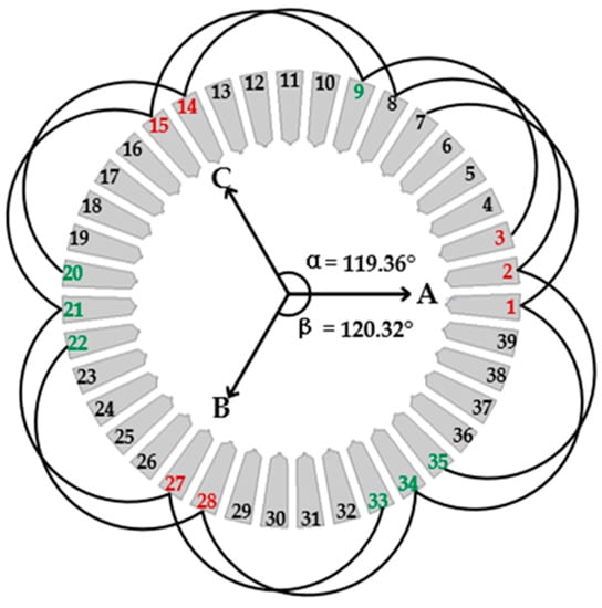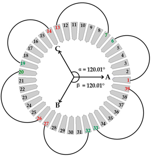 In order to compare the performance, it is compared with the double-layer unconventional unbalanced winding of 39-slot, 6-pole winding. The winding connection diagram is shown in Figure 3. Its symmetry is higher than that of the double-layer unconventional winding.