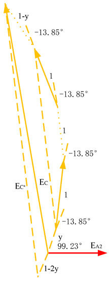 In order to solve y by angle, the superposition calculation of each vector is shown in Figure 11. The final synthetic appropriate amount is EC, and the initial length of each appropriate amount is 1. After the slot offset, the final length of eb4 and EC4 are y and 1 − y, respectively. For the convenience of the calculation, a vector with a length of 1 − 2y is introduced, and the triangle formed with EC and Ec* can be obtained by the sine theorem of formula (1). Y = 0.33 corresponds to 9 slots on each vector. Therefore, the three slots on EC4 are replaced by the slots on Eb4.
