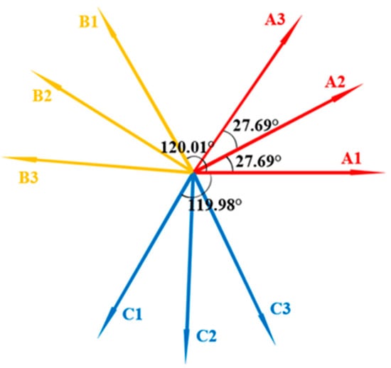 Because phase A is taken as the stationary phase, its vector does not need to be changed. The vector diagram is shown in Figure 5, and the final synthetic vector angle is −20.77°.