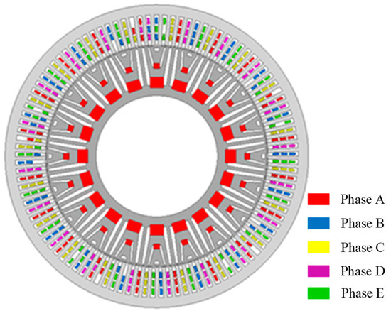 In order to study the influence of unconventional winding on machine performance, a triple-winding, 105-slot, 20-pole machine’s schematics are shown in Figure 14. The PM material is Y30, and the remanent magnetization is 0.4T. Similar to the slot and pole structure, the motor uses the previous three-layer winding structure instead of the traditional double-layer winding structure, which provided higher winding utilization and hence improved motor output performance.