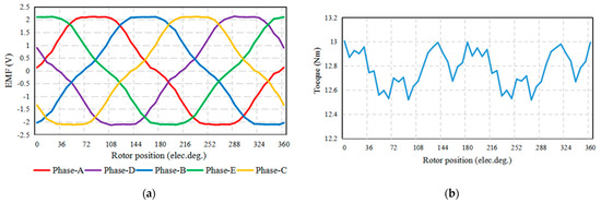 Finally, according to this winding connection mode, a 2D-simulation model is built for simulation, and its no-load back EMF waveform is shown in Figure 15a, which has good symmetry. The torque simulation results are shown in Figure 15b with an average torque of 12.78 Nm and a torque ripple of 3.82%, which meets the feasibility in performance.