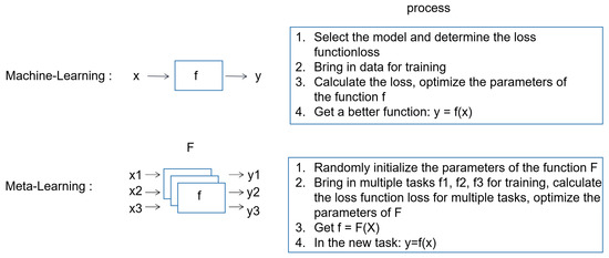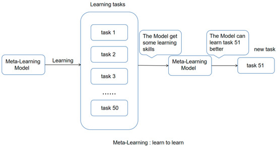 The ability to learn quickly is a significant difference between humans and artificial intelligence; humans can use their prior knowledge and experience to learn new techniques rapidly. The training and assessment of meta-learning can be compared to people swiftly adjusting to new activities after acquiring fundamental abilities [19]. For instance, during a child’s development, he or she will be exposed to many new things to recognize; when a child recognizes a bird and then encounters a puppy, he or she can distinguish between the two. In conventional machine learning model training, a huge number of images of puppies and birds are often required for the model to recognize and distinguish between them. As shown in Figure 1, the meta-learning model can gather experience by learning 50 tasks, and when the 51st task is faced, it will perform better than conventional machine learning.