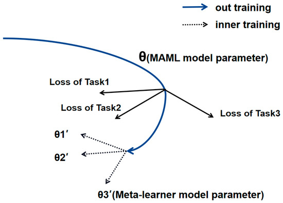 The Model-Agnostic Meta-Learning (MAML) algorithm is proposed by Finn et al. [20]. Model-Agnostic refers to model-independent, indicating that this algorithm will not pick network architecture and can be well integrated with most network architecture algorithm models. As we all know, the initial parameters of the model play an important role in improving the convergence speed of the model and finding the optimal solution of the parameters. As shown in Figure 3, the core idea of the MAML algorithm is to train a set of more appropriate initial parameters of the model through a small amount of training data and then bring a set of parameters into the subsequent training so that the model can converge quickly and obtain good training results.