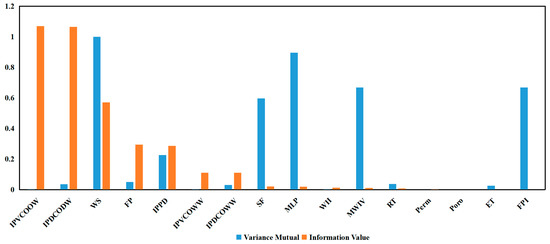 In practice, a single variance filter may filter out features that are significant to the labels due to issues such as inconsistent data dimensions or a lack of understanding of business mechanisms, whereas the mutual information method can capture arbitrary relationships (including linearity and nonlinearity) between features and labels, unlike the chi-square filter and F-test. Therefore, this work calculates the data using both variance filtering and mutual information. The variance calculation can notice the dispersion of the sample data set, while the mutual information value can establish the degree of linkage between the features and labels. The pertinent calculation outcomes are displayed in Figure 4.