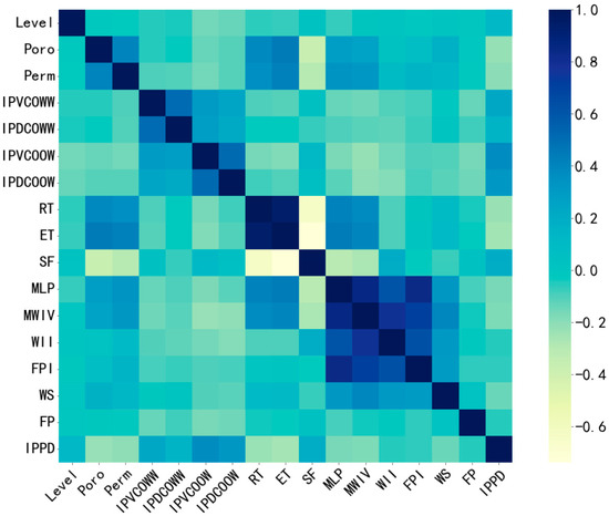 Figure 4 demonstrates that there is almost no correlation between reservoir thickness (RT), porosity (Poro), effective thickness (ET), fluid-producing intensity (FPI), and labels. However, there is a strong correlation between the interlayer permeability variation coefficient of oil wells (IPDCOOW), the interlayer permeability dart coefficient of oil wells (IPDCOOW), and labels. However, the correlation between the features cannot be explored by screening with the variance filtering and mutual information method only, and this paper uses the Pearson correlation coefficient method to study the correlation between the features.