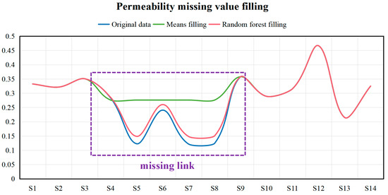Taking filling the missing value of permeability of a well as an example, two methods of mean filling and random forest model filling are used to fill the data. The results are shown in Figure 6, the distribution of data obtained by random forest filling is closer to the real data.