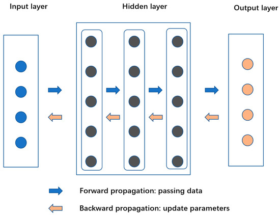 The artificial neural network (ANN) is constructed to imitate the process of information transmission in the neural network of the human brain; data are modified linearly by parameters (weights and deviations) on neurons and nonlinearly by activation functions. The data are passed from the input layer to the hidden layer, where they are then processed and passed to the output layer, a process known as forward propagation; the parameters of the neurons are updated iteratively by optimizing the loss function, a process known as backward propagation, as illustrated in Figure 7.