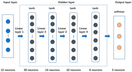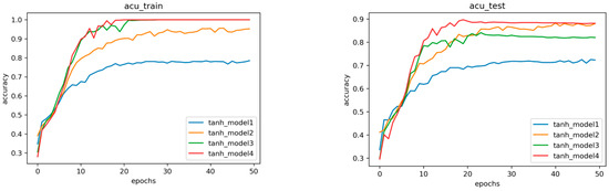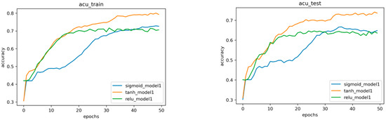 The activation function is a crucial element of neural networks. A neural network without an activation function is just a linear regression, but the addition of an activation function enables the network to transform input data nonlinearly, allowing it to learn more complex tasks. Common activation functions include, among others, sigmoid, tanh, and relu. As indicated in Figure 8, we build three BP neural network models using the aforementioned three activation functions; the learning rate is 0.1, we bring in data for training, and compute the model’s accuracy, evaluate their effects, and select the optimal activation function.